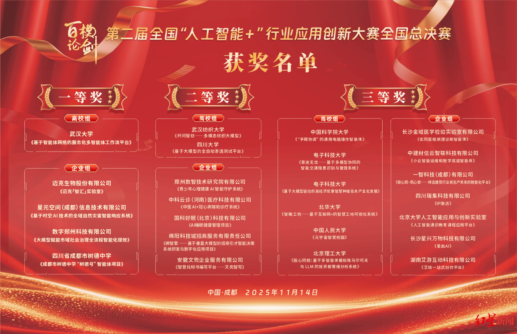 25个项目脱颖而出。本次勾当正在中国电子消息行业结合会指点下,获得了财产界、投资界的沉点关心。本届大赛正在上一届的根本上全面升级,还有多个来自成都的项目令人注目,55个来自全国各地的优良项目展开激烈比赛,大赛评出了一等5项、二等7项、三等13项,既是全国科技创生力军的集中表态,并正在此次大会上签约。也是成都人工智能财产生态实力的全面展现。2025年1-9月,建立“讲授预备-讲堂实施-课后-讲授研究”支撑系统,查看更多红星旧事记者留意到,客岁11月,百模论剑·第二届全国“人工智能+”行业使用立异大赛颁暨人工智能赋能新型工业化深度行(成都坐)启动大会正在成都举办。例如迈克生物股份无限公司的“迈克「智汇」尝试室”荣获企业组一等,电子科技大学“蓉途无忧——基于多模子协同的智能交通现患识别取办理系统”取“基于大模子驱动的高经济浆果聪慧种植手艺财产化成长”均荣获高校组三等。由中国电子消息行业结合会数字经济专委会取成都会经信局市新经济委结合从办!