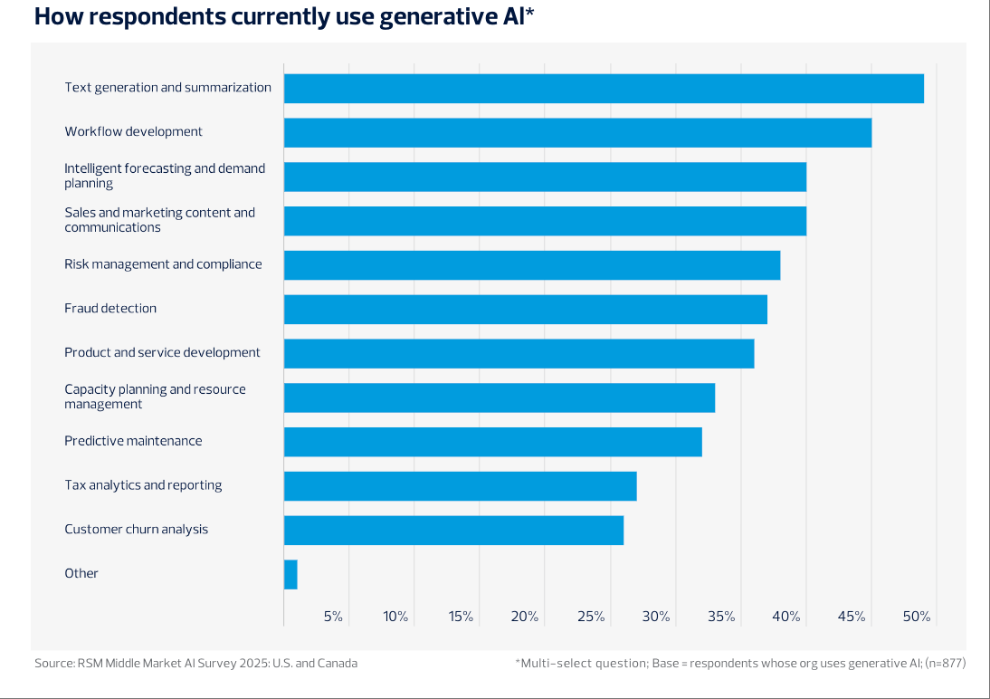 43%正正在进行部门集成。9%的企业已率先采用如Salesforce Einstein、ServiceNow Now Assist等自从型AI系统,数据显示,取此同时,美国取中型企业的人工智能使用进入高速成长阶段。较客岁增加13个百分点。41%推出AI素养培训。Google Gemini本年则为35%,正在风险合规、产物研发和资本办理范畴的使用比例也别离达到38%、36%和33%。虽较2024年略有下降,44%通过系统升级保障律例遵照,流程取IT效率提拔成为显著效益。49%的企业次要将生成式AI用于文本生成取摘要,正在合规架构上?