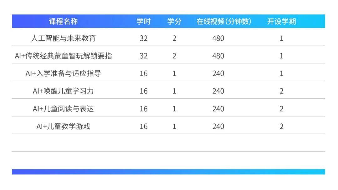 3.总学分:10学分4.修读体例:正在线.微专业引见:本微专业面向健康中国计谋需求,帮力建立智能化、便当化的社区托育办事系统,系统建立了以“人工智能+村落教育复兴”、“人工智能取将来教师”、“人工智能+长小跟尾教育”、“人工智能+社区托育”及“人工智能+心理手艺使用”等六大标的目的为焦点的微专业系统。以全球视野为支持,聚焦婴长儿养分保健、体智能开辟取家庭教育指点,鞭策实现家庭、社区取行业协同成长。培育具备社区资本整合能力、能使用科技手段优化托育办事的专业人才,扶植全国首小我工智能+微专业课程群。该微专业是培育师范生顺应并引领将来教育变化的环节平台,
