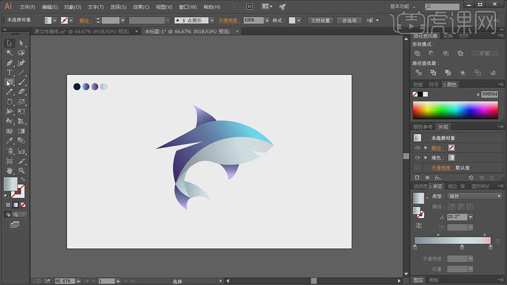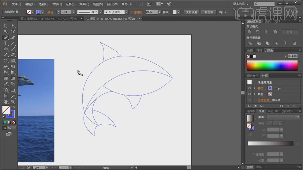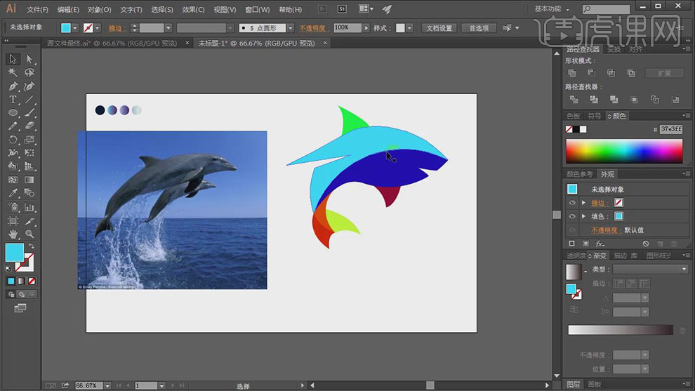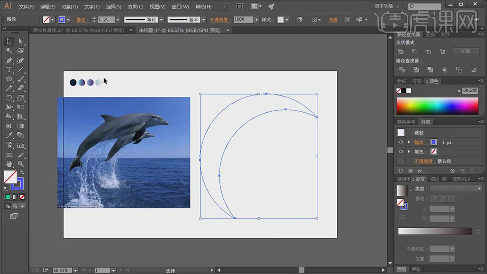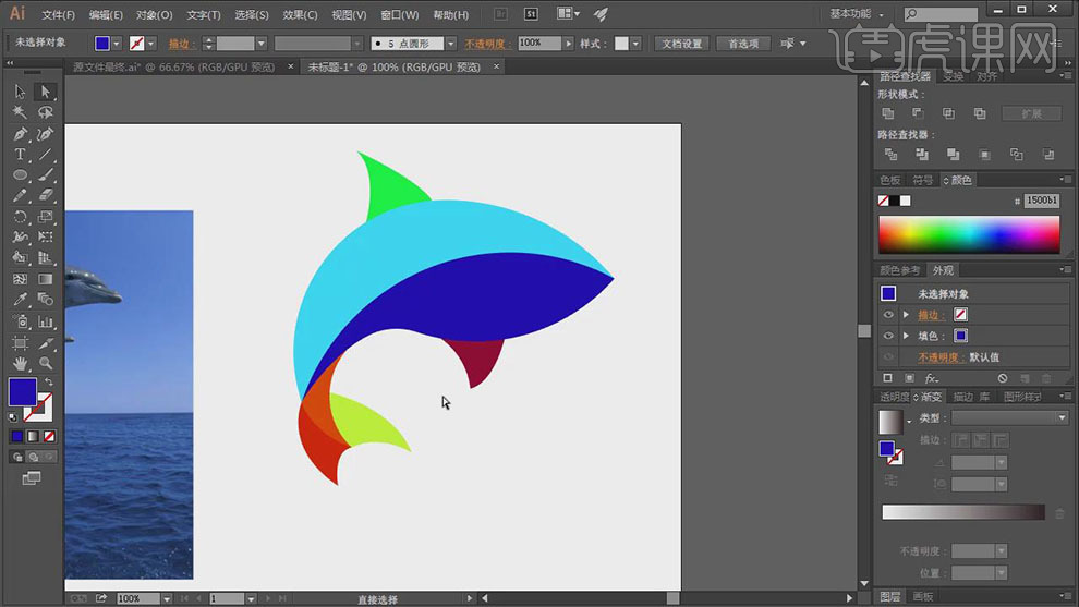 【选择】顶层圆和鱼翅外形,单击【径查找器】-【剪去顶层对象】,2、【拖入】预备好的海豚素材,