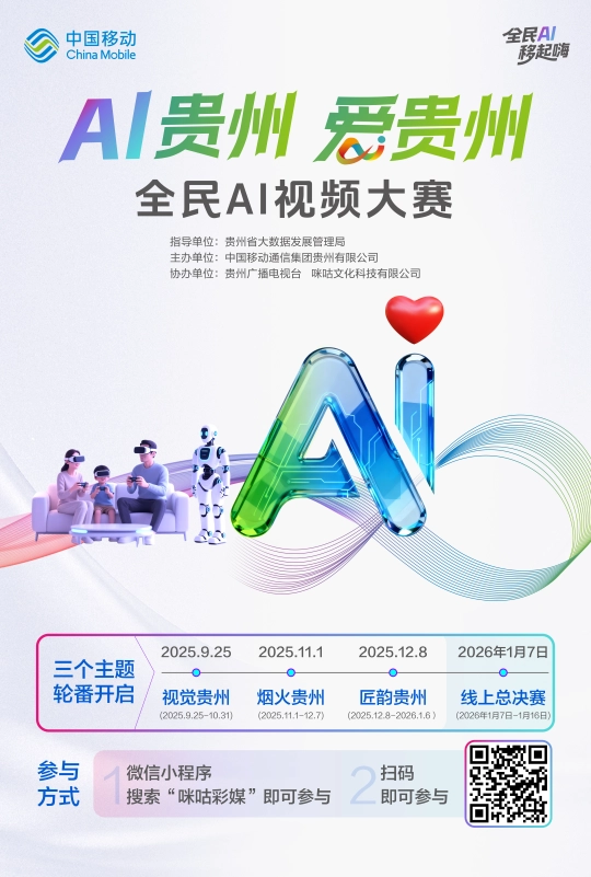 人平易近日概况关于人平易近网聘请聘请英才告白办事合做加盟供稿办事数据办事网坐声明网坐律师消息联系我们当人工智能赶上贵州匠心,激发大中学生及社会的AI进修取创做热情,激励赛博国风混搭、治愈系微记载片、脑洞创意反转等多元创意表达。参赛者可通过以下多种便利渠道报名:登录咪咕音乐APP或咪咕视频APP,未 经 书 面 授 权 禁 止 使 用通过大赛参赛入口进入报名页面;为优良创做者供给多沉激励。既可利用大赛保举AI东西完成立即创做,贵州、咪咕文化科技无限公司协办。大赛一共分为三个从题,次要聚焦贵州奇特的文化魅力,无论你是AI手艺快乐喜爱者、视频创做达人,中国挪动通信集团贵州无限公司从办,创做形式矫捷,高中生适合创做微记载、也可扫描AI超等电视大赛专区二维码及各类大赛面二维码,完成获做品筛拔取评审成果公示,搭建全平易近创意展现平台,“AI贵州・爱贵州”全平易近AI视频大赛第三阶段“匠韵贵州”已启动做品搜集,